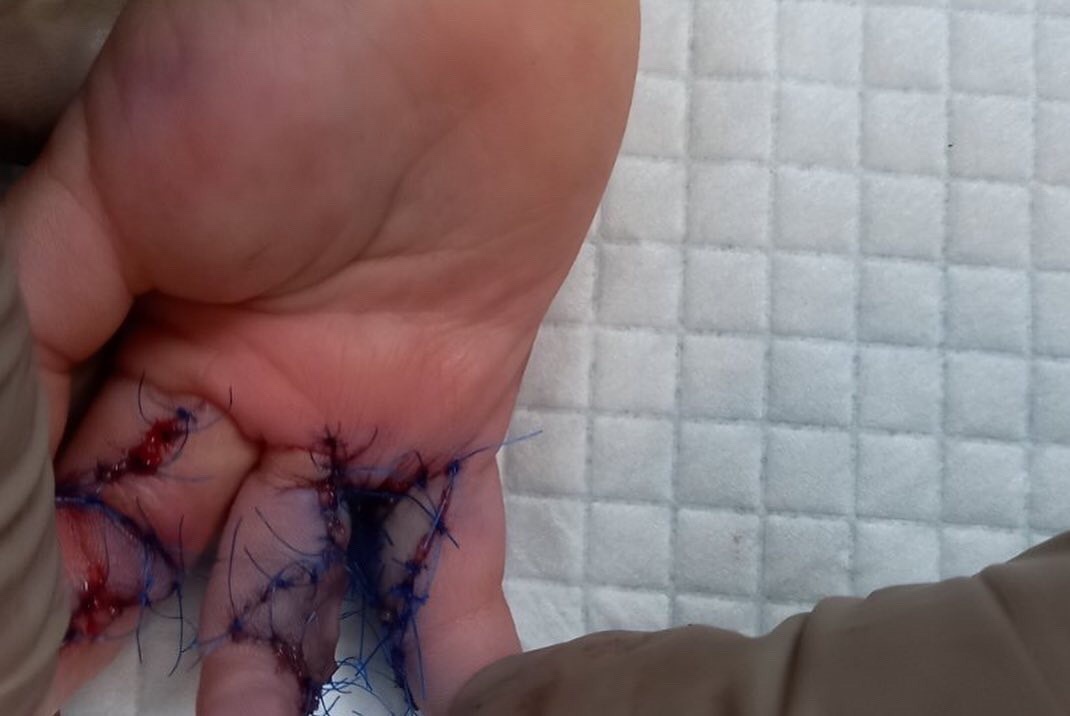 Проведено: разъединение 3-4 пальцев с использованием кожной пластики свободным кожным лоскутом, которое выкраивалось на животе. Место забора лоскута на животе зашито косметическим швом. Места соприкасания лоскутов на соседних пальцах изолированы между собой парафиновой сеткой с серебром.
